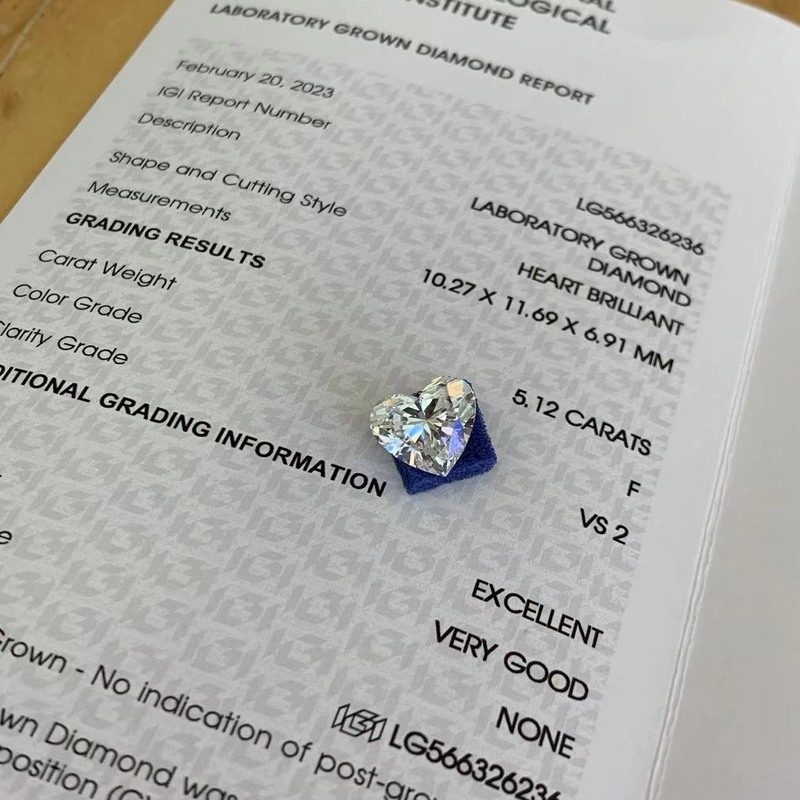 5.12ct Lab Growm Diamant Coupe de cœur CVD F VS2 2EX N IGI